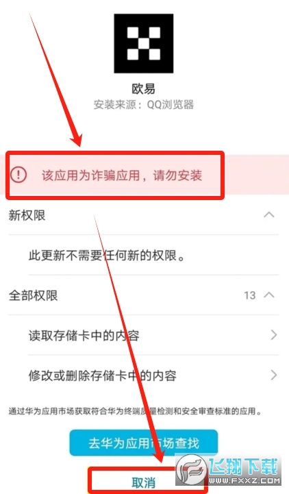 这个时候他会提醒我们“该用户为诈骗应用,请勿安装”。我们不用管它直接点击【取消】。