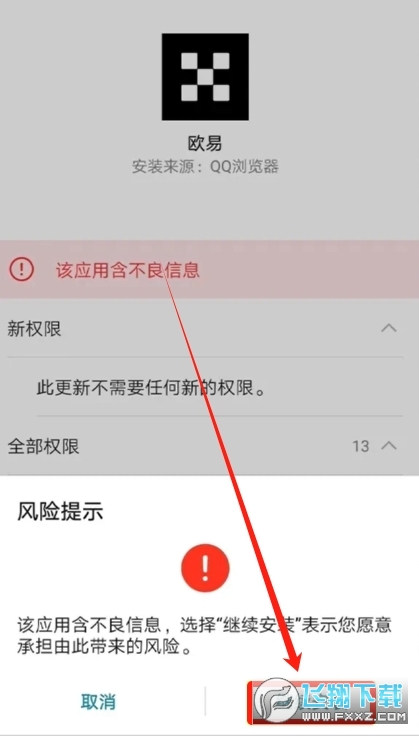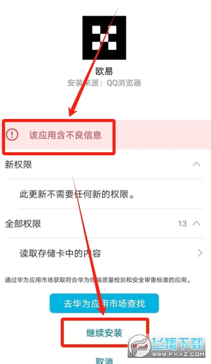 最后还有一个风险提示,告诉我们该应用含不良信息,选择继续安装表示您愿意承担由此带来的风险。他这么一而再再而三的阻碍我们去下载这个APP,因为我们是在浏览器里面去下载的APP,它不来源于华为的应用商店,所以这也相当于华为手机的一个免责声明,我们选择【继续安装】就可以了。