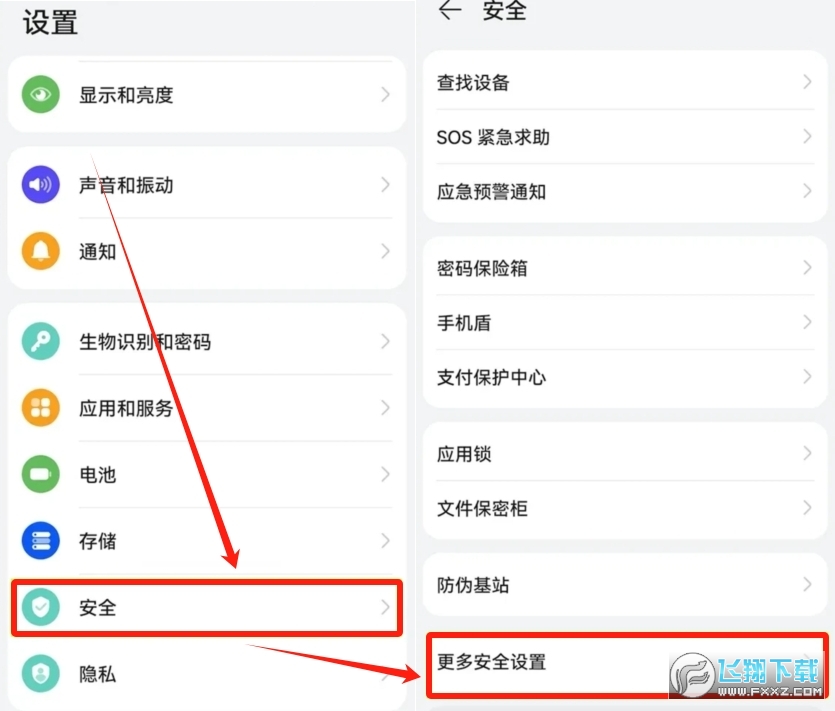然后再在设置里面的【安全】,找到【更多设置】。