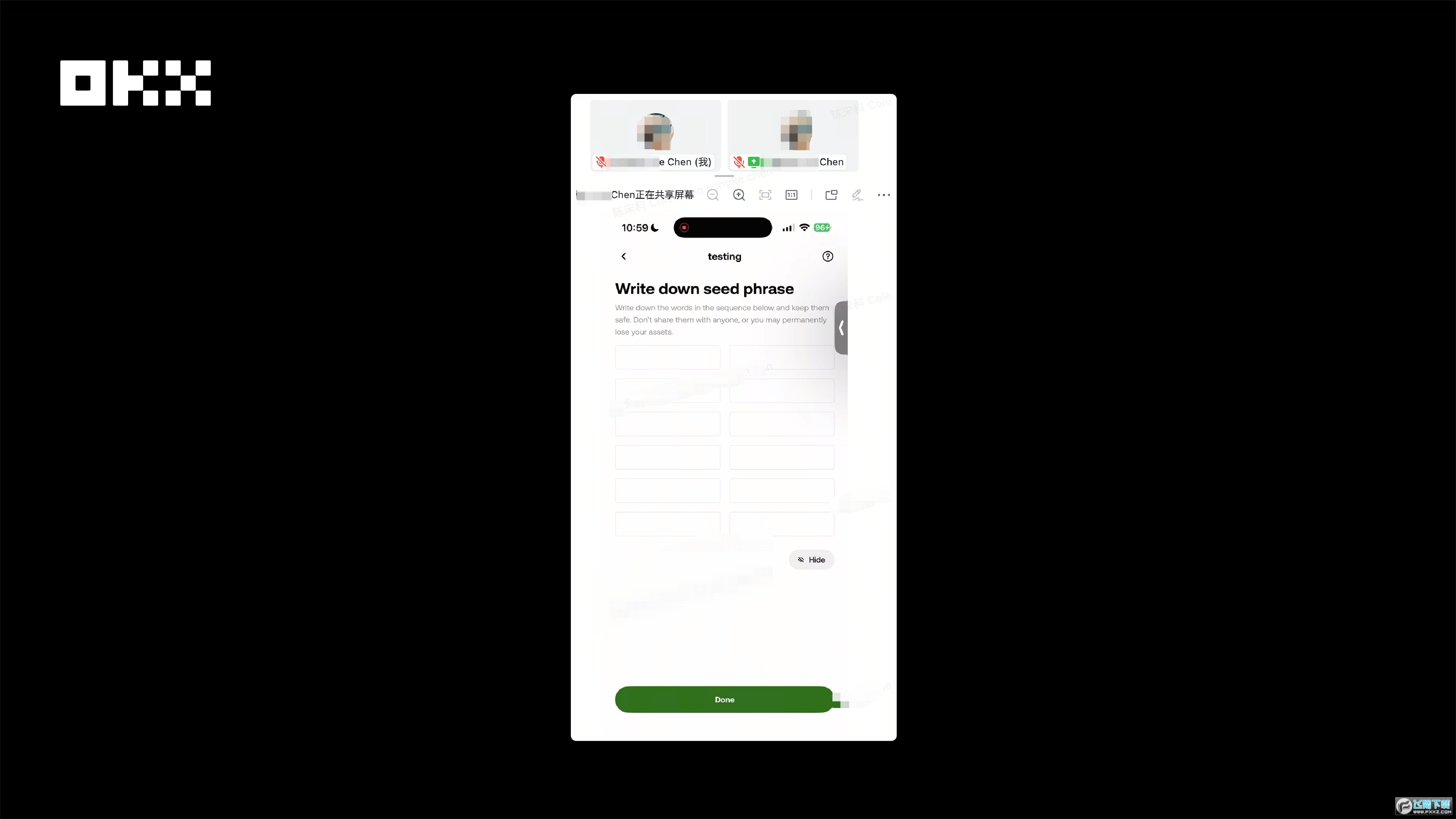 图片:检测到在投屏,OKX Wallet会自动隐去助记词和私钥,他人无法看到文本