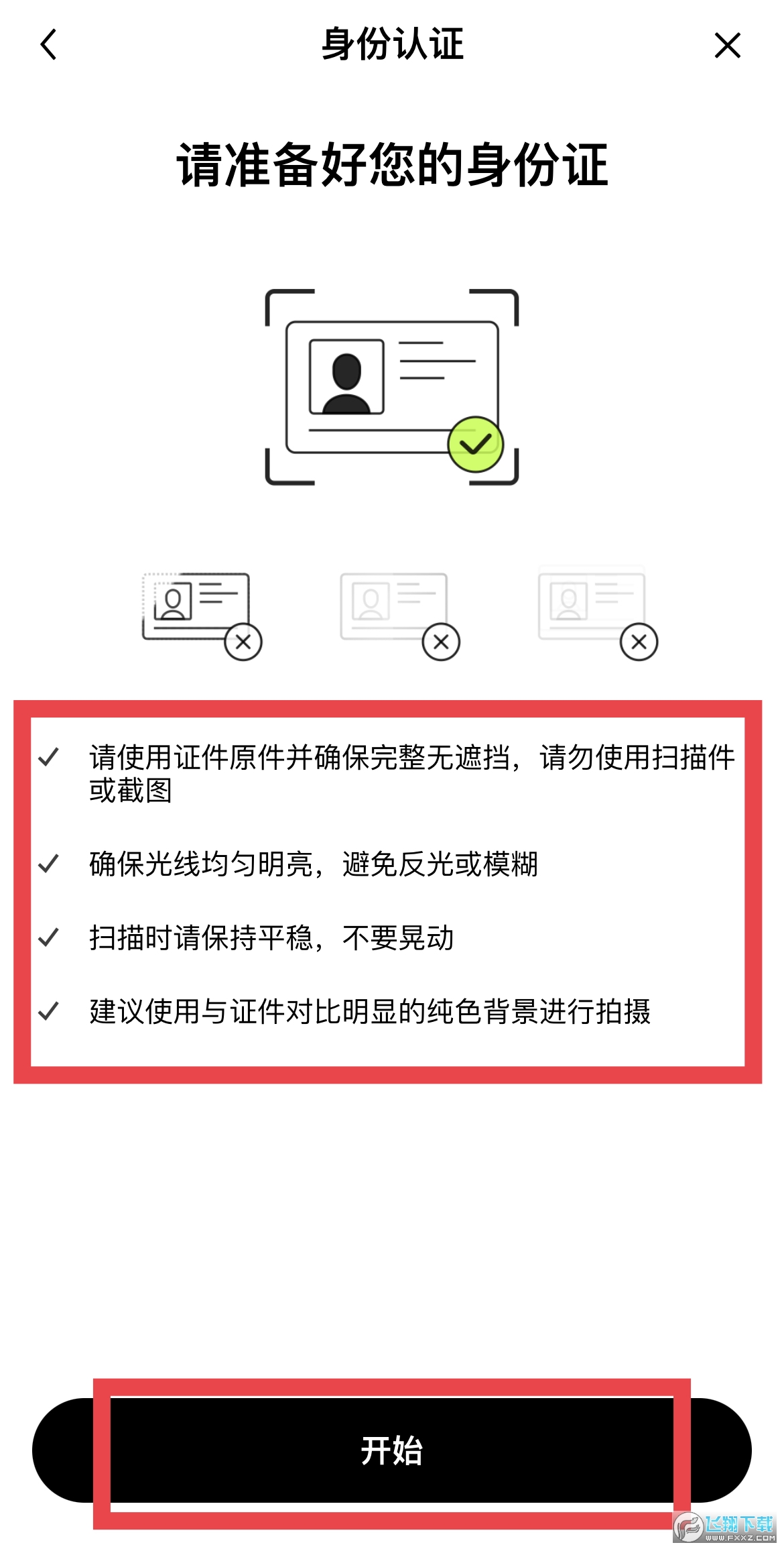 点击【开始】按钮,按照下方图片红框内要求拍摄身份证正反面,即可完成认证。