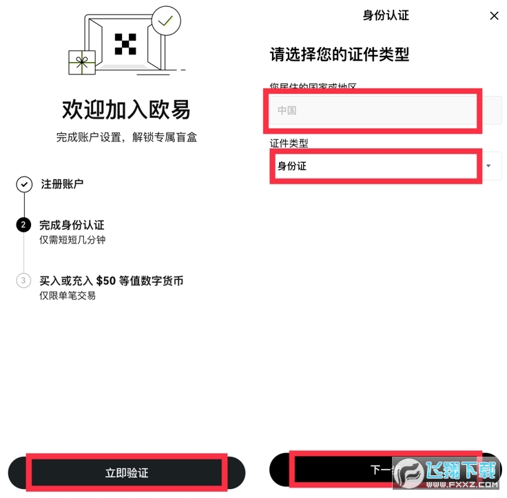 点击【立即验证】,地区选择【中国】,证件类型选择【身份证】,点击【下一步】按钮