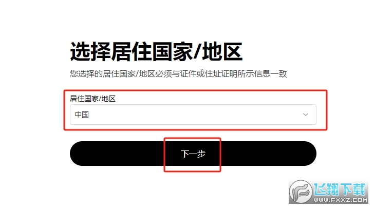 4.居住地/国家选择“中国”,点击【下一步】按钮。