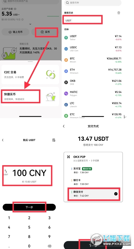 进入欧易App首页,找到“买币”按钮,点击“快捷买币”;选择币种位“USDT”;输入购买金额,点击“下一步”;