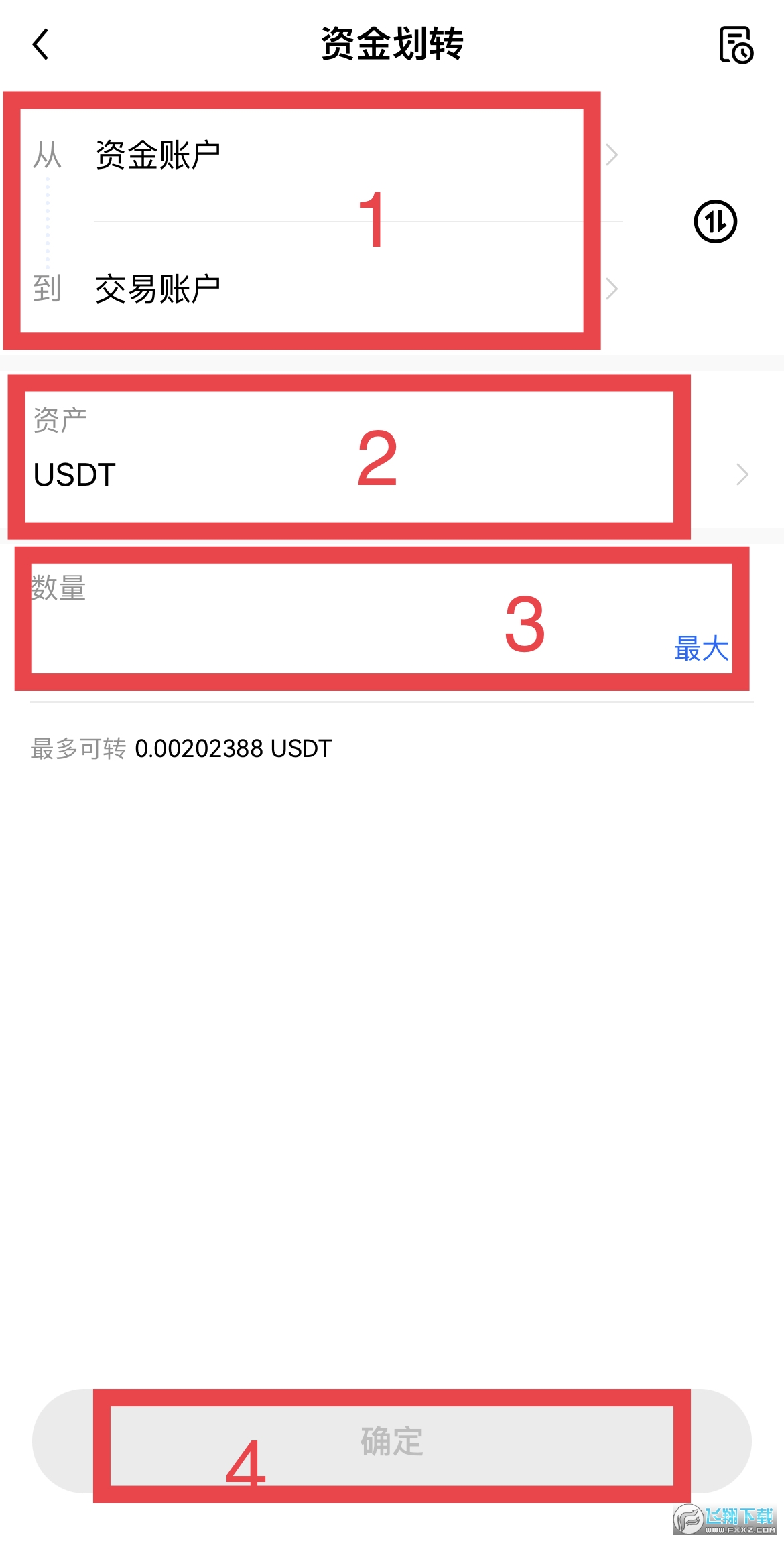 注意划转的方向为由“资金账户”划转到“交易账户”,选择币种为:USDT,数量点击“全部”,点击【确定】按钮。