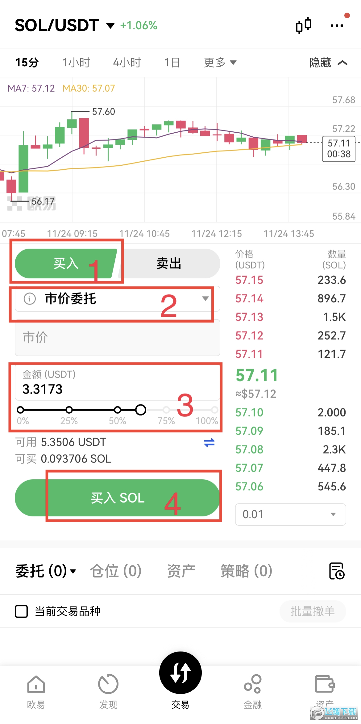 市价买入,以当前市场上最优的价格立即成交。只需输入你想花费的USDT金额或想买入的SOL数量即可。
