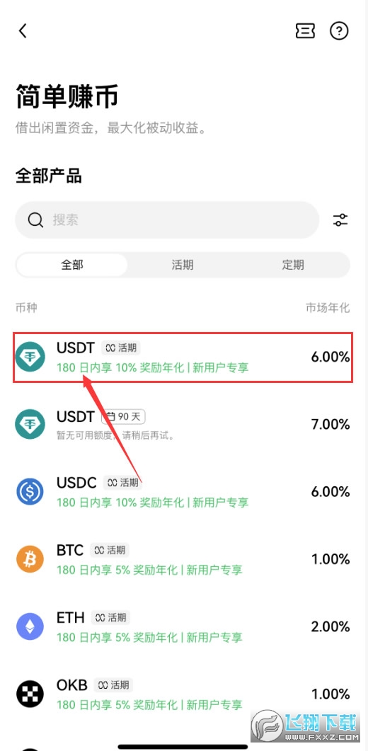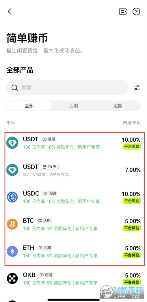 首先第一个需要讲到的就是欧易的简单赚币活期理财功能。