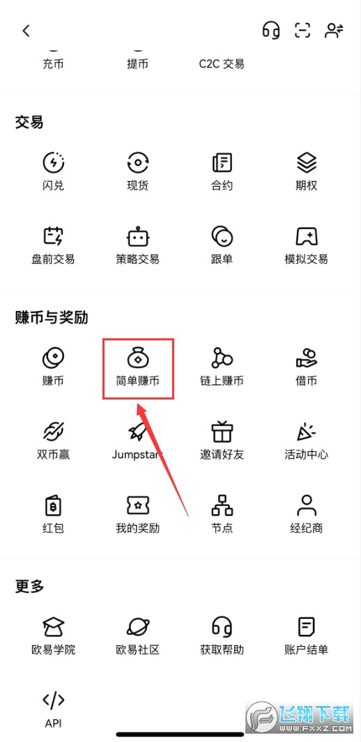 2、往下滑,找到【简单赚币】。