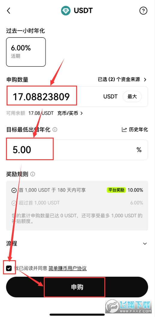 7、我们进入到具体页面之后,可以看到过去一个小时活期理财收益率是6%。接着我们可以输入【申购数量】,然后勾选一下条款,点击【申购】。