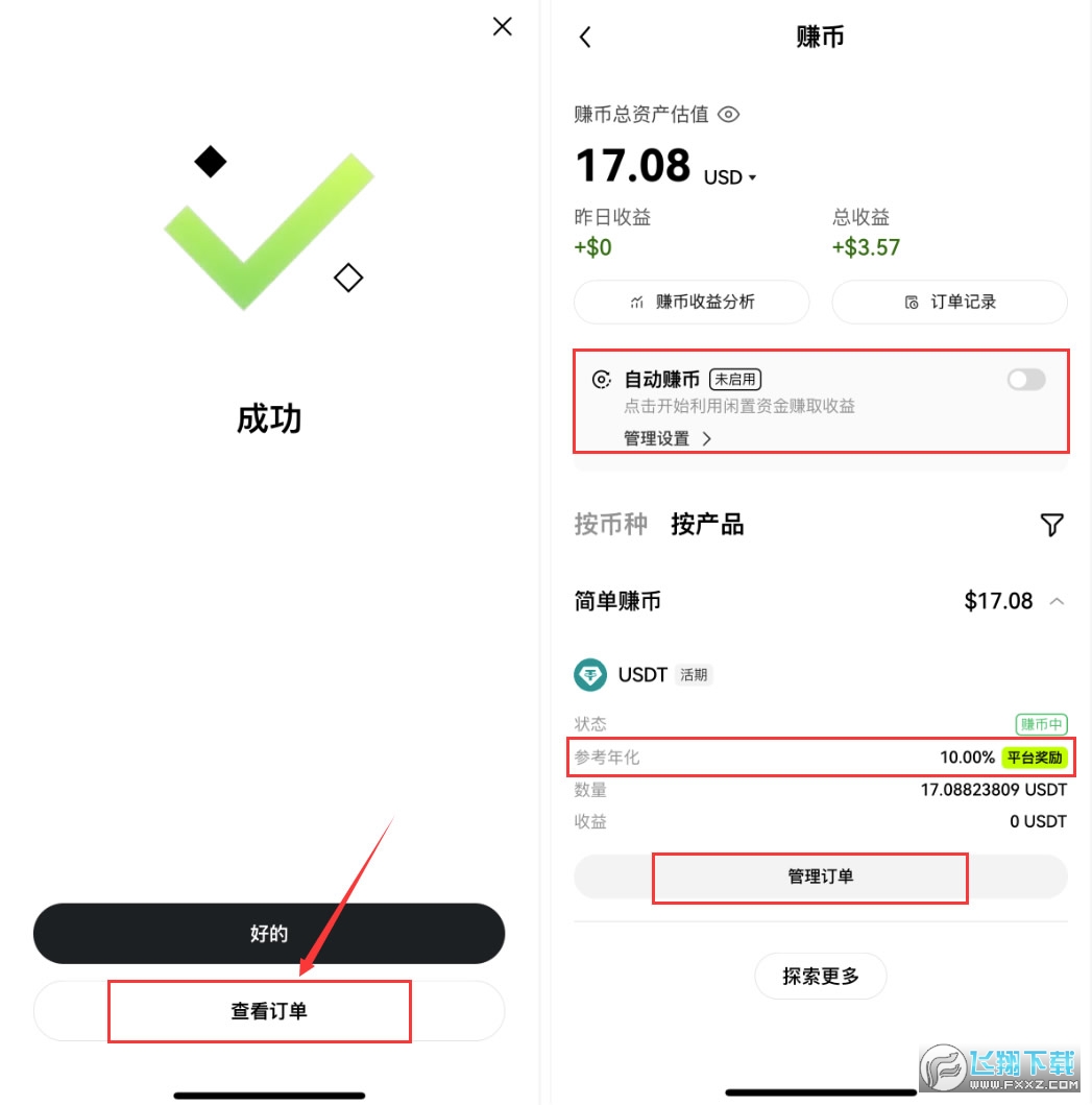8、点击【查看订单】,在这个界面我们可以看到,当前的年化收益率确实是10%。我们还可以点击上方的“自动赚币”,功能开启之后欧易会自动将我们钱包中的闲置资金,转入到简单赚币的活期理财当中。你可以点击【管理订单】。