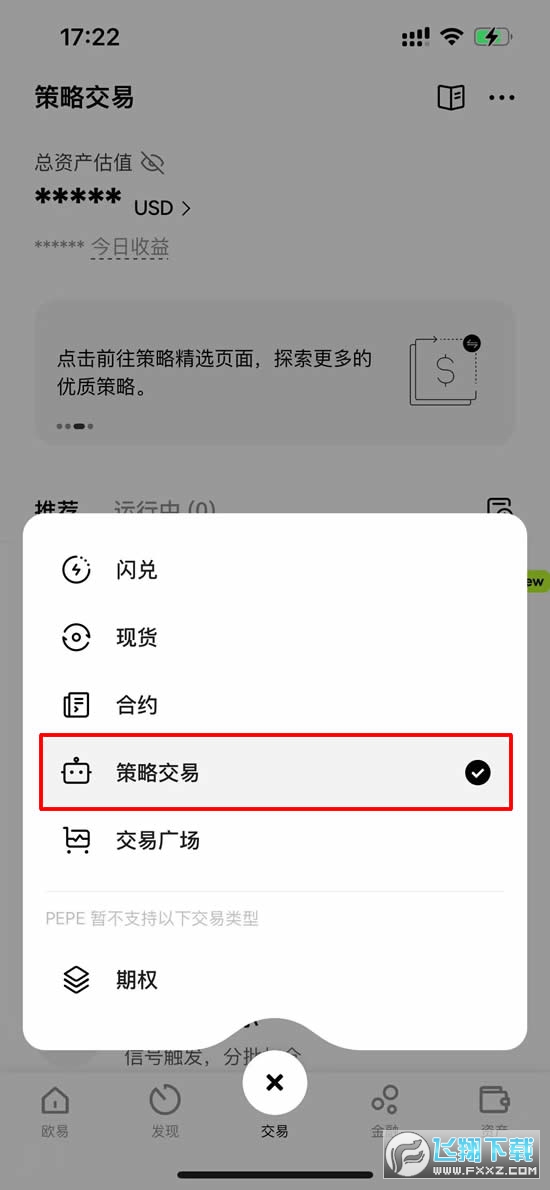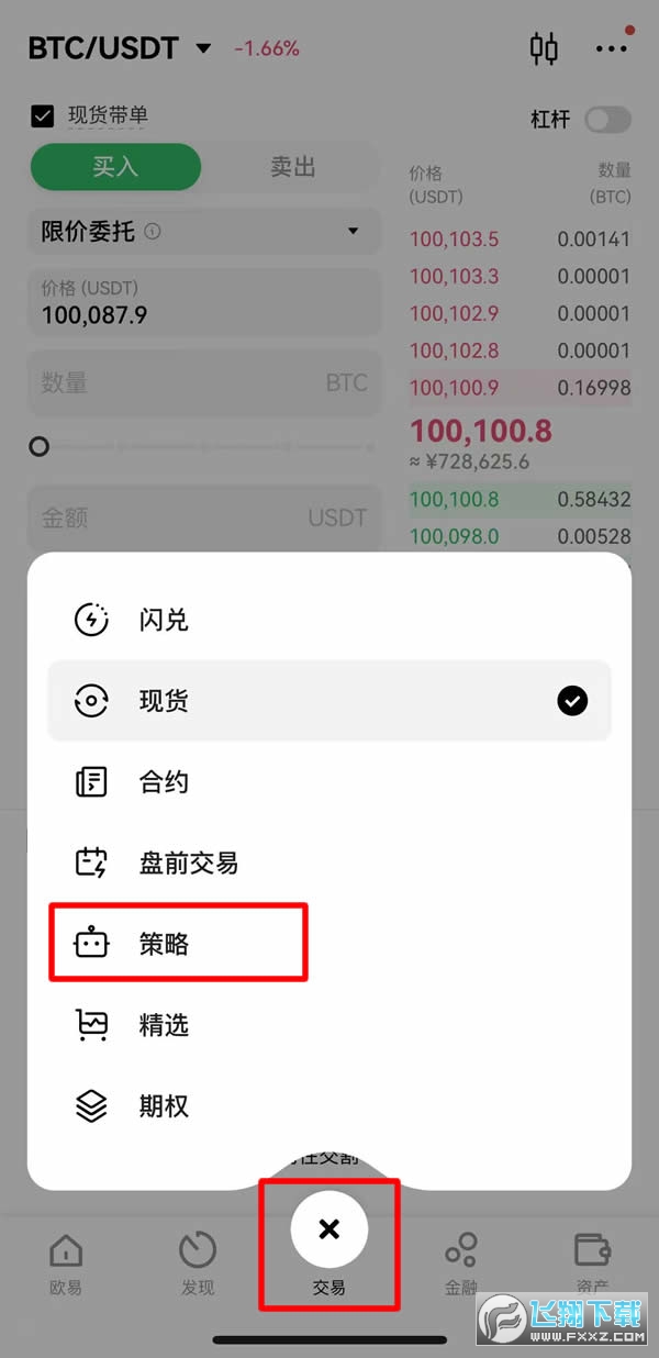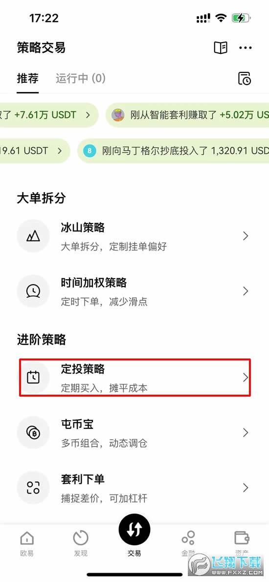 1、打开欧易APP(官方注册 官方下载)首页,点击下方的【交易】按钮,点击两次,选择【策略交易】。