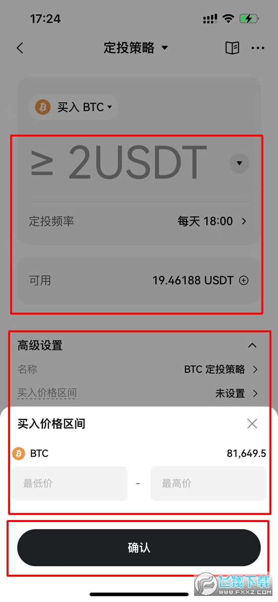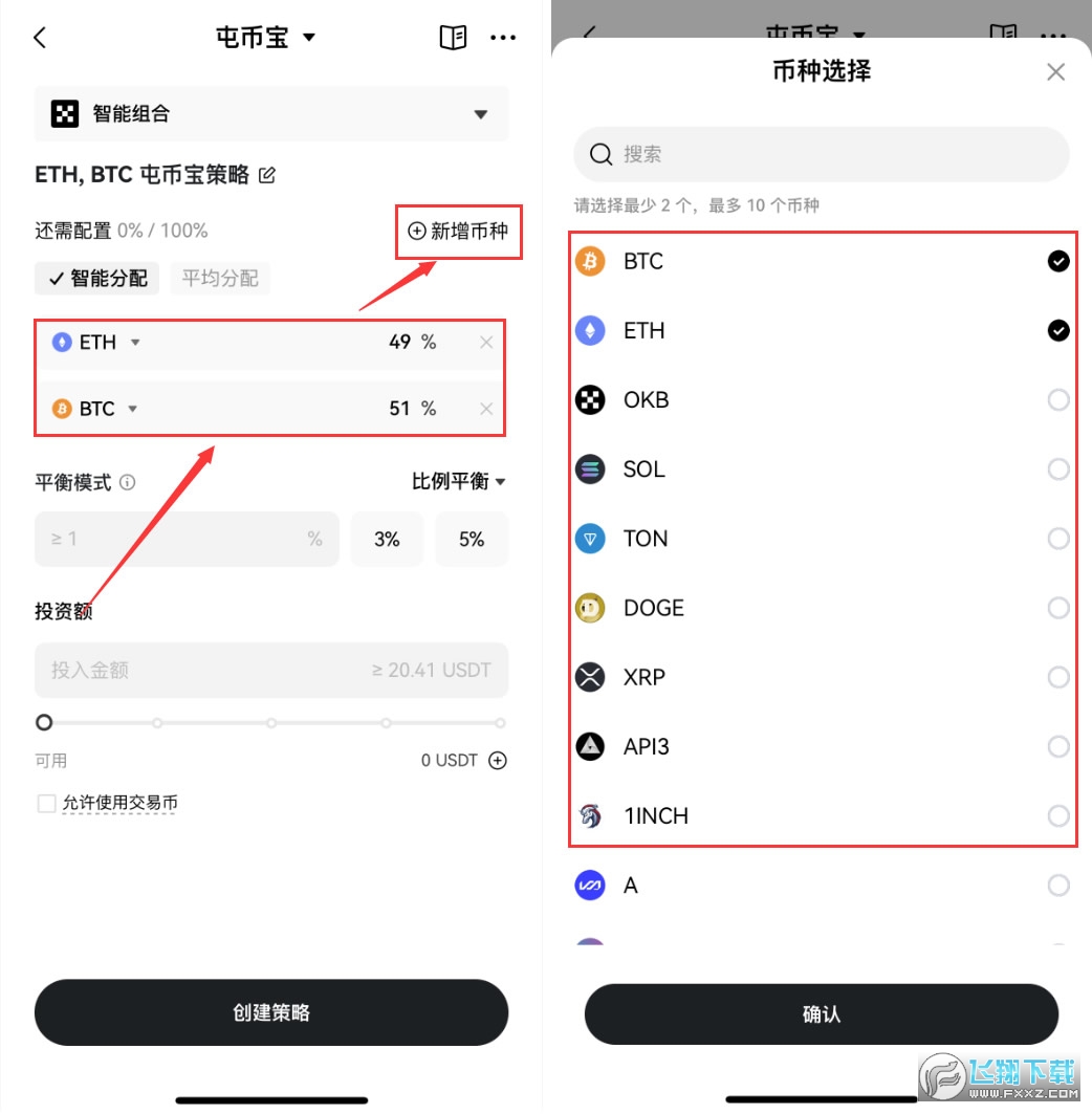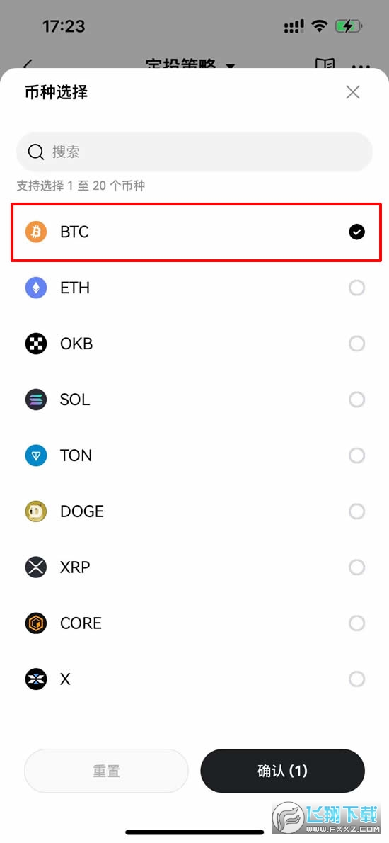 3、然后我们就可以配置定投的标的、定投频率以及每次的定投额。它支持匹配多个投资标的,比如说我们就可以勾选比特币。点击【确认】。