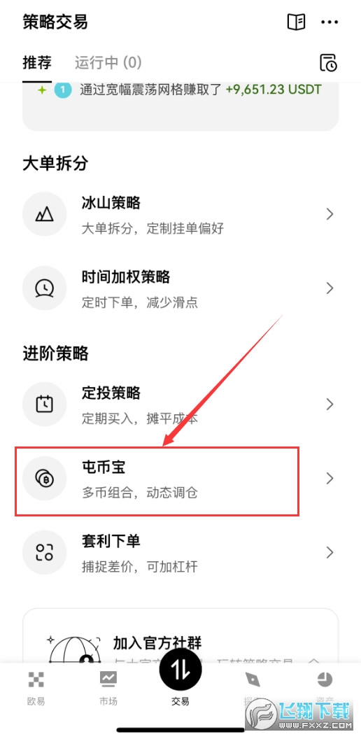 1、打开欧易APP的策略交易里面拉到下方,点击【屯币宝】。