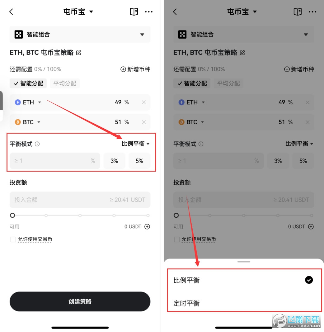 3、这里以太坊我们就可以设置为60%,比特币设置成40%。这里有两种平衡模式,一种是比例平衡,也就是说各个币种的比例发生变化,并超过阈值的时候,就会进行一次rebalance套利操作。另外一种是定时平衡,按照固定的时间去检测偏离程度,触发rebalance操作。
