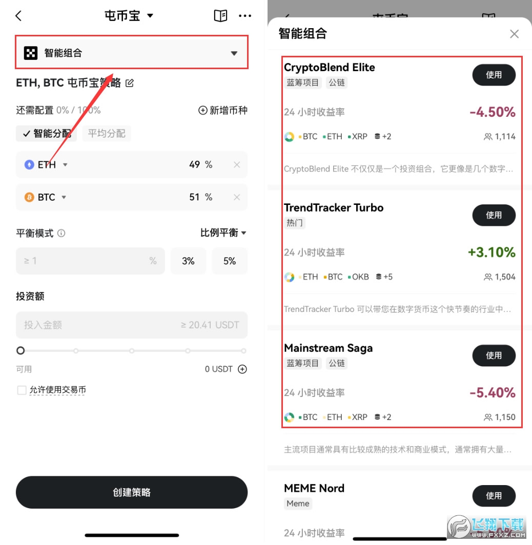 4、当然如果你不知道如何配置投资组合的话,欧易也推荐了一些智能组合,点击上方的“智能组合”,可以看到这里有很多个项目,比如说第一个和第三个是蓝筹投资组合,所选的标的都是主流加密货币,包括比特币、以太坊、索拉纳、XRP这些老牌项目,风险相对可控。第二个就是热门的趋势投资组合,会包含一些最近热炒的加密货币项目,风险很高。这里的第四个是meme币的投资组合。大家可以根据自己的投资偏好,去挑选一个投资组合。