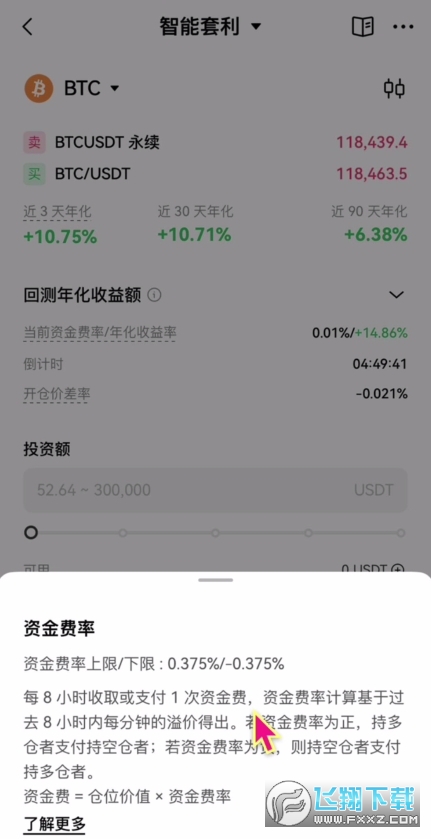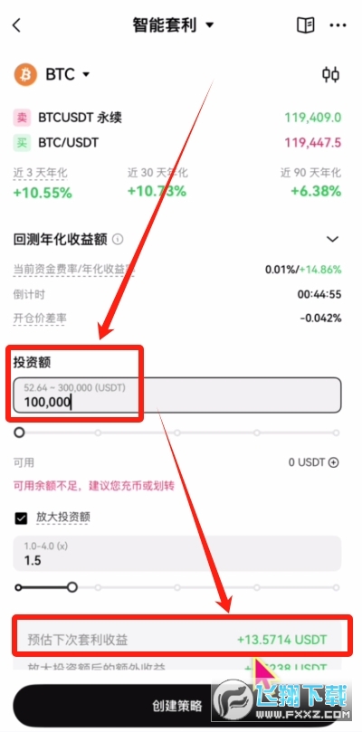 可以看到它的比特币套利策略,如果投入10万USDT的话,单次可以套利13个USDT,年化收益率在10%左右,还是非常不错的。