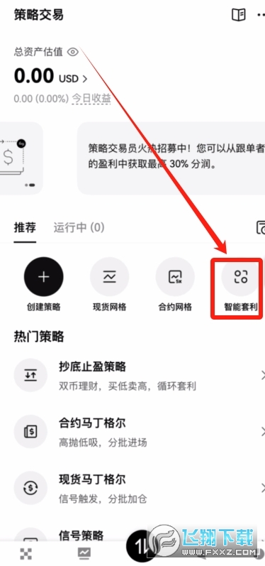 我们还是进入到欧易的策略交易界面,点击【智能套利】。