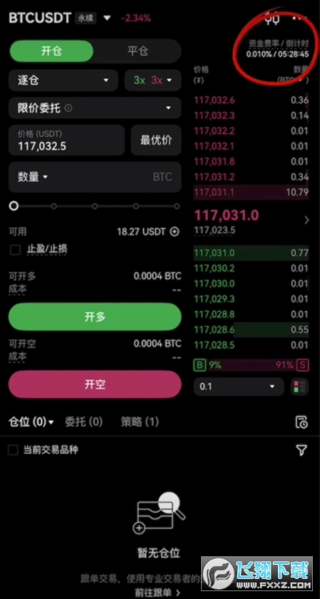 我们进入到比特币永续合约的交易界面可以看到,右上角有一个资金费率的标识,它就是用于平衡多头和空头仓位,防止合约价格和现货价格长期偏离。
