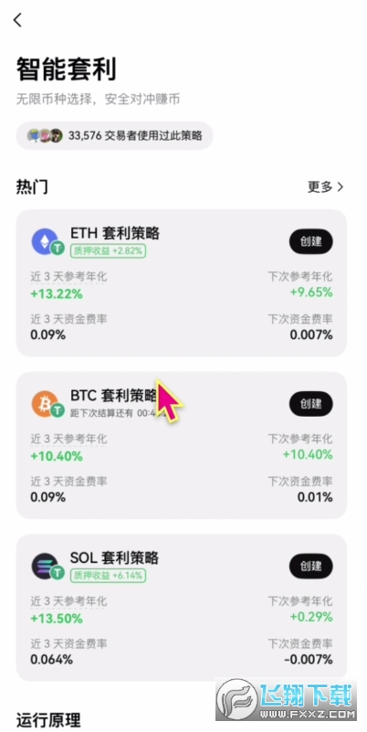 接下来欧易的第四个理财产品“智能套利”。智能套利是我认为欧易做的最好,使用体验最佳的一个产品。因为套利本身对于新手小白来说,是一件理解成本和难度都比较高的操作。而欧易的智能套利,则解决了这个过程中的痛点以及难点问题。