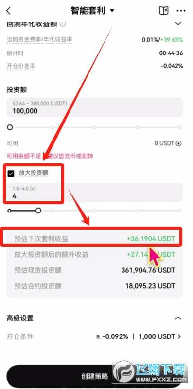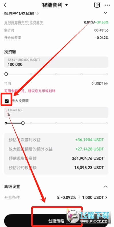 但是这里我们需要注意一下,放大投资额是通过借贷的方式,增加整体的套利仓位,提高最后的收益率,可以理解为是一种上杠杆的行为。我这里就不用再勾选了,大家根据自己的情况看看是否要勾选,然后点击【创建策略】,这个智能套利就会自动化的运做起来了,之后就不需要我们人工去维护了。每天8小时定时收到一次资金费,非常的不错,很适合追求稳定收益的投资者。