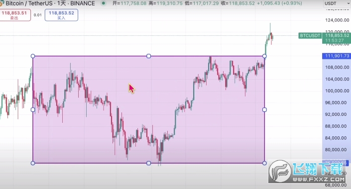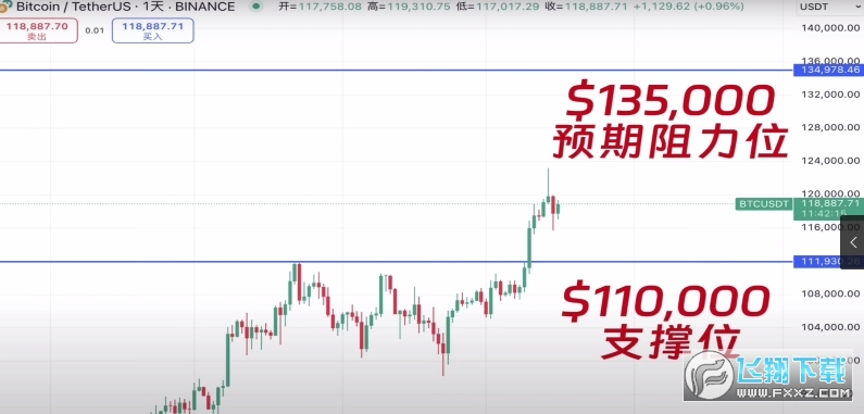 “价格区间”得看你希望现货网格套利多长时间,如果只运行一个月,那么区间就会设置的小一些,如果说运行半年以上,那么区间就设置的大一些。因为时间越长,它的波动幅度就越大,价格区间就要设置的大一些。比如说我想要运行一个月时间的比特币现货网格,那么我会参考比特币短期的支撑位和阻力位。可以看到比特币从5月到7月这段时间里,一直在尝试突破11万美元的大关,最近几天成功突破了。那么11万美元就可以作为之后的支撑位,所以说现在现货网格的下限,可以设置为11万美元,我预期比特币在一个月内可能最高涨到13.5万,之后会遇到一波回撤,那么现货网格的上限就可以设置为13.5万美元。