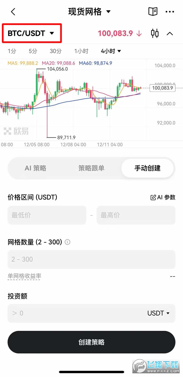 进入现货网格页面后,从画面左上角,点击选择你要执行现货网格的币种。