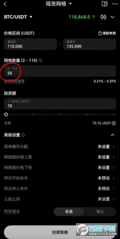 接下来就是“网格数量”。当价格区间固定的时候,网格数量越多,说明网格间隔越小,交易执行的就会越频繁,可能会捕捉到小的波动,更适合高波动的市场。但与此同时由于交易频繁上升,最后交易手续费就会变多,这同样取决于你对于行情的判断。如果是高波动市场,还是建议设置更多的网格数量。因为我运行的时间比较短,价格区间小,短期波动会高一些。所以我这里就设置50个网格,数量偏多。如果你想要运行中长期的现货网格,运行半年以上的时间,建议设置网格数量少一些,比如说30个以内。