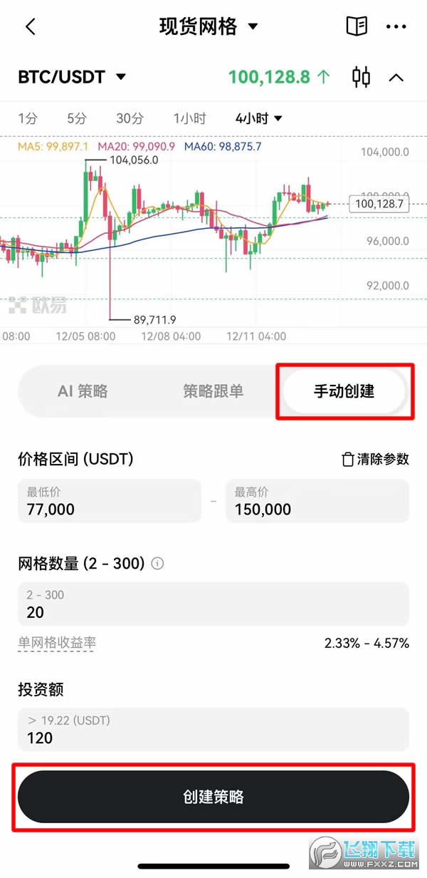 选定后,输入投入金额与设定相关参数后,点击「创建策略」就完成现货网格设定了!