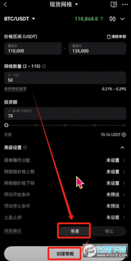 下面还有一个等差,等比网格设置参数。顾名思义等差网格就是以固定金额绝对值,来划分网格区间。比如说10万,10万五,11万,11万五,12万这个样子。而等比就是以固定百分比来递增,或者是递减网格线,低价区网格密集,高价区网格稀疏。一般来说,等差网格更适用于价格上下波动均匀的市场,而等比网格更适用于抄底。在低价区会成交买入更多次,从而在高价区锁定更好的利润。我个人感觉等差网格的理解成本更低,通用性更强一些,我这里就设置为“等差”网格。然后我们点击【创建策略】就可以创建成功了。