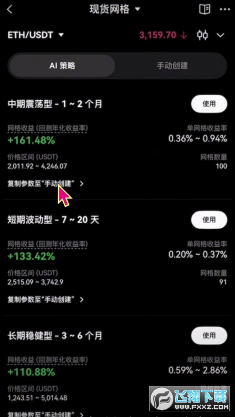 当然如果你觉得自己设置起来比较麻烦的话,欧易还提供了AI网格策略。这里面有三种策略,适用于短期、中期和长期网格套利,并展示了对应的投资回报率,挑选一个你自己觉得更合适的策略。你也可以复制到手动创建中,在它的基础上调整一下参数。
