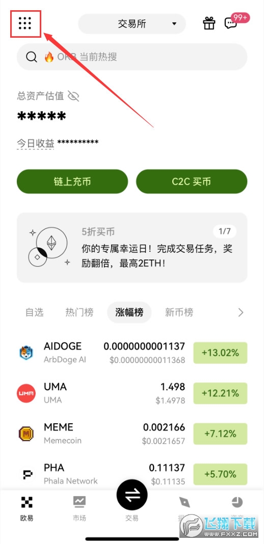 1、我们打开欧易APP(官方注册 官方下载),点击左上角的9个点。