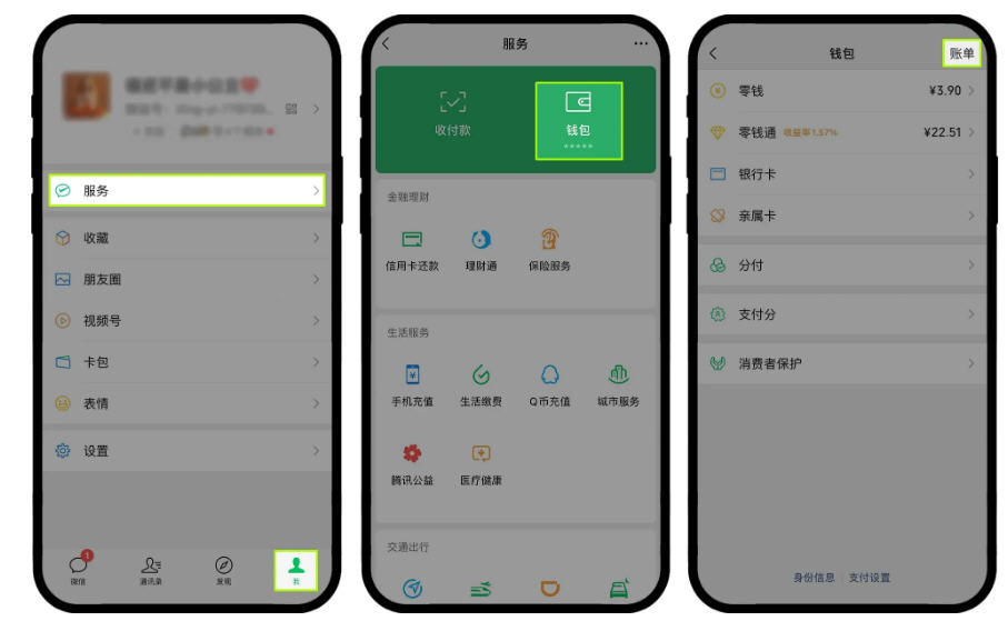 打开微信,点击【我】-【服务】-【钱包】;