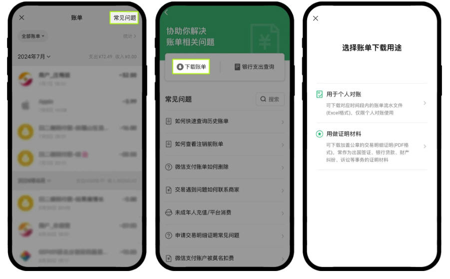 点击右上角【常见问题】-【下载账单】选择账单下载用途,有用于个人对账(最长可以导出三个月的账单)和用做证明材料(最长可选择一年账单);