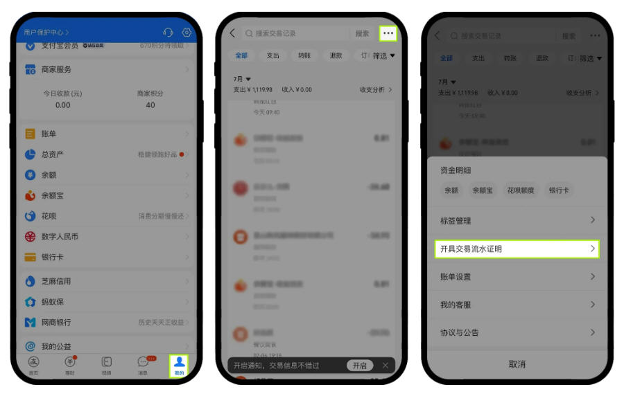 请打开支付宝 App - 【我的】 - 【账单】 - 点击右上角 【…】 - 【开具交易流水证明】,后续您按照页面提示及您个人需求操作;