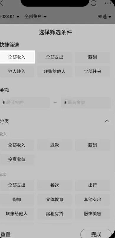 收支明细较多时,可筛选出收入明细单独截图,操作方式为:点击页面右上角“筛选”,弹窗中选择“全部收入”,点击“完成”(不支持筛选的可以直接全部截图)。