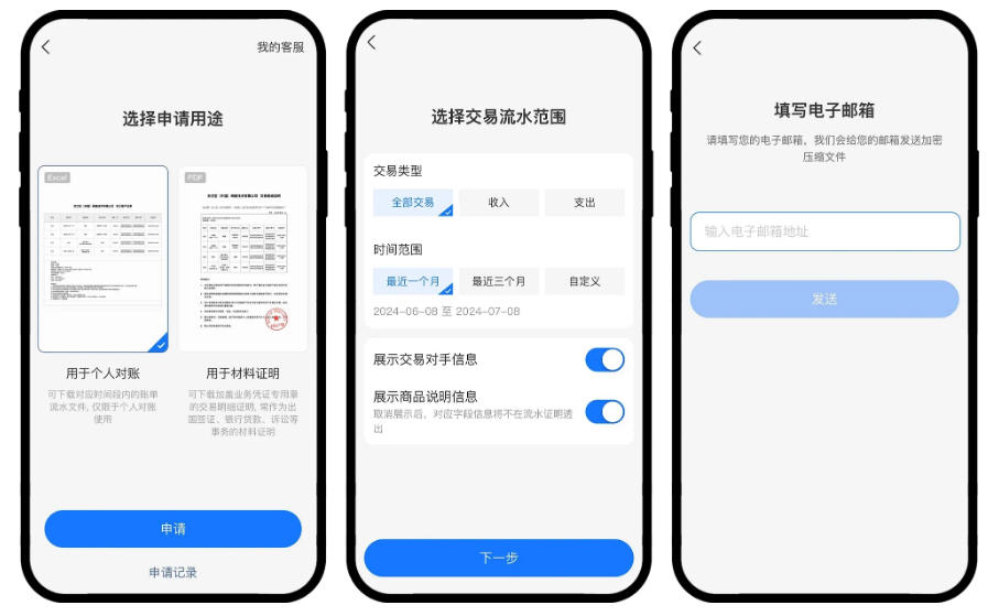 选择需要的流水账单,然后根据页面显示输入邮箱账号和支付验证后,点击【确定】并等待有关流水账单发送至您的邮箱。