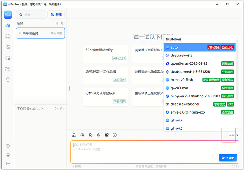 使用技巧:在AiPy Pro客户端【设置】功能中开启【自动选择智能体】,可进一步提升任务执行效率,优化使用体验。