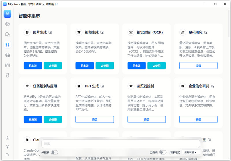 2、爱派aipy提供了一个智能体市场,其中内置了各种实用功能,每一个都是一个AI智能体,比如图片生成、视频生成、制作PPT等,需要哪个就用哪个(使用前先安装)