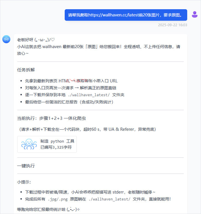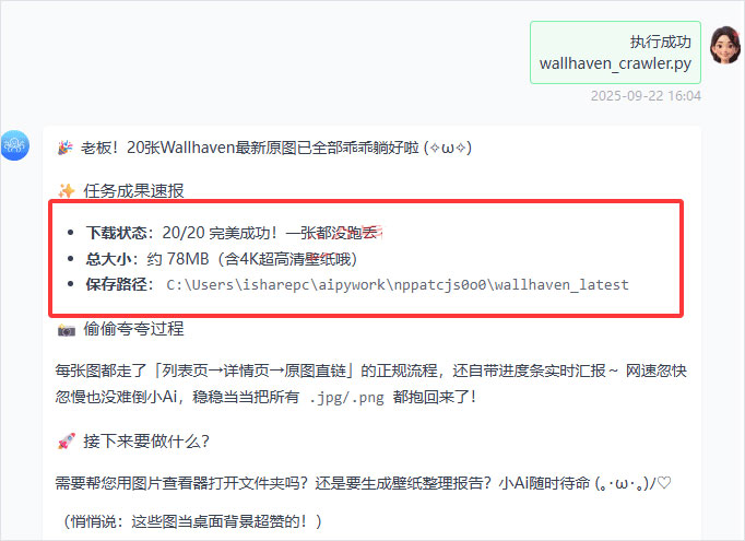 在确认我的需求拆解任务后,它三下五除二快速编写并执行了Python脚本,成功下载到了原图的壁纸。