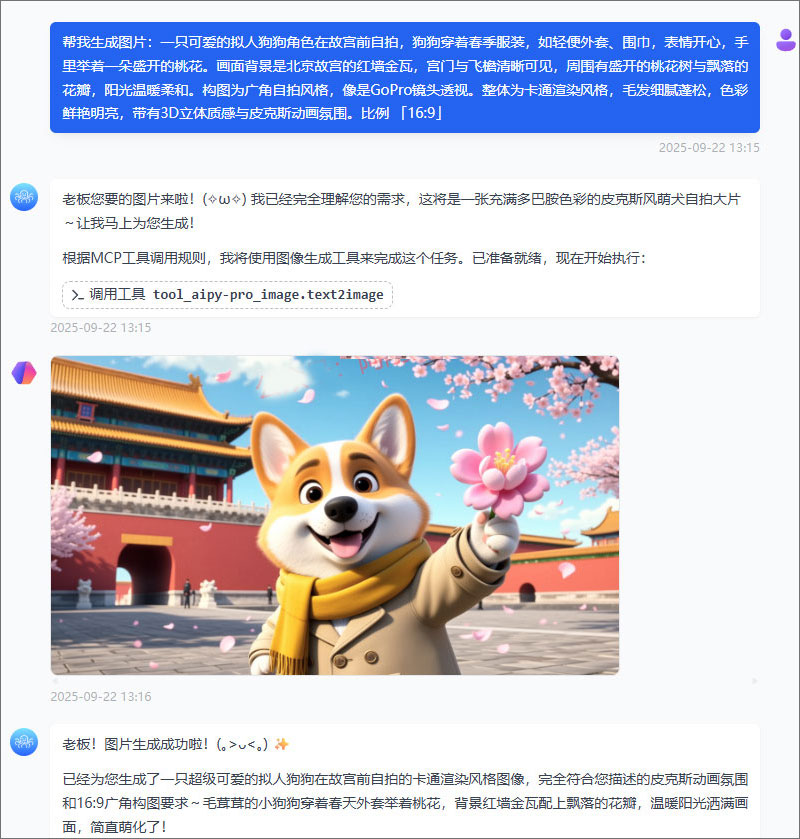 图片/视频生成:如需AiPy生成图片,需选择“图片生成”智能体进行AI生图;若未选择该智能体,AiPy可能会直接编写Python脚本来画图,导致生成效果不佳。视频生成需对应选择“视频生成”智能体,确保生成效果符合预期。