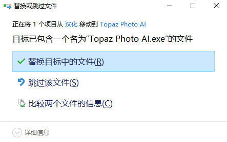 4、然后再将 汉化补丁 文件夹中的 Topaz Photo AI.exe 复制到安装目录里,默认路径:C:\Program Files\Topaz Labs LLC\Topaz Photo AI;
