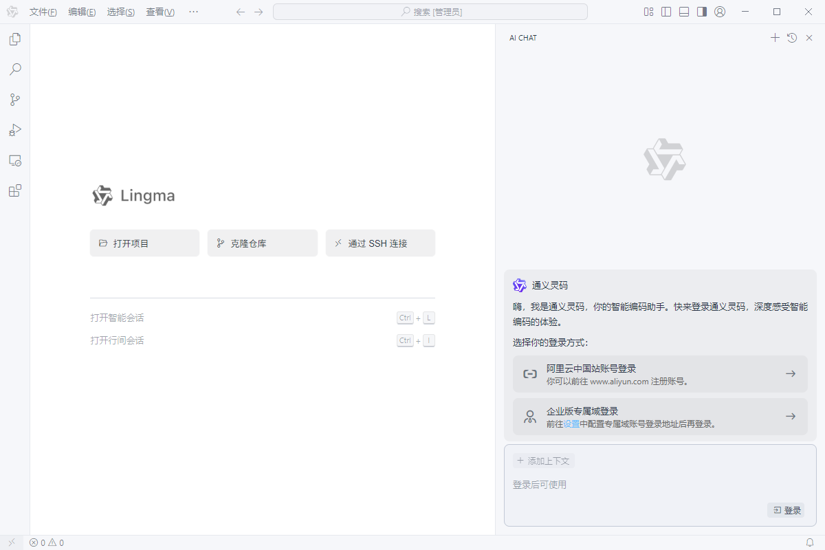 打开 Lingma IDE,首次启动 Lingma IDE 时,您会看到欢迎页面。在欢迎页面提供了一些入门操作。