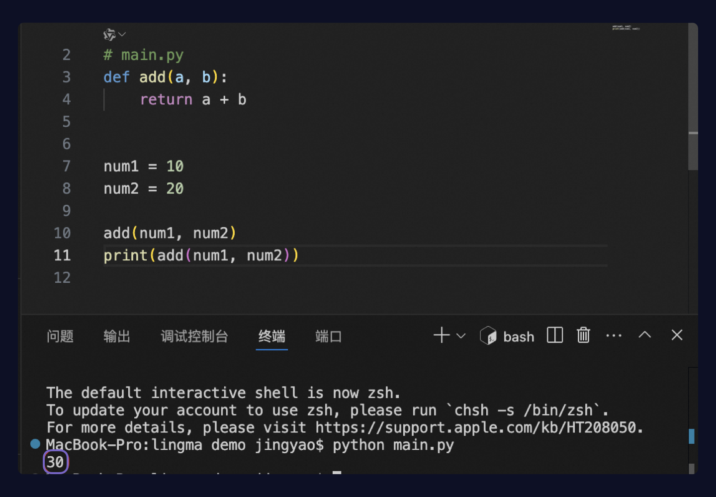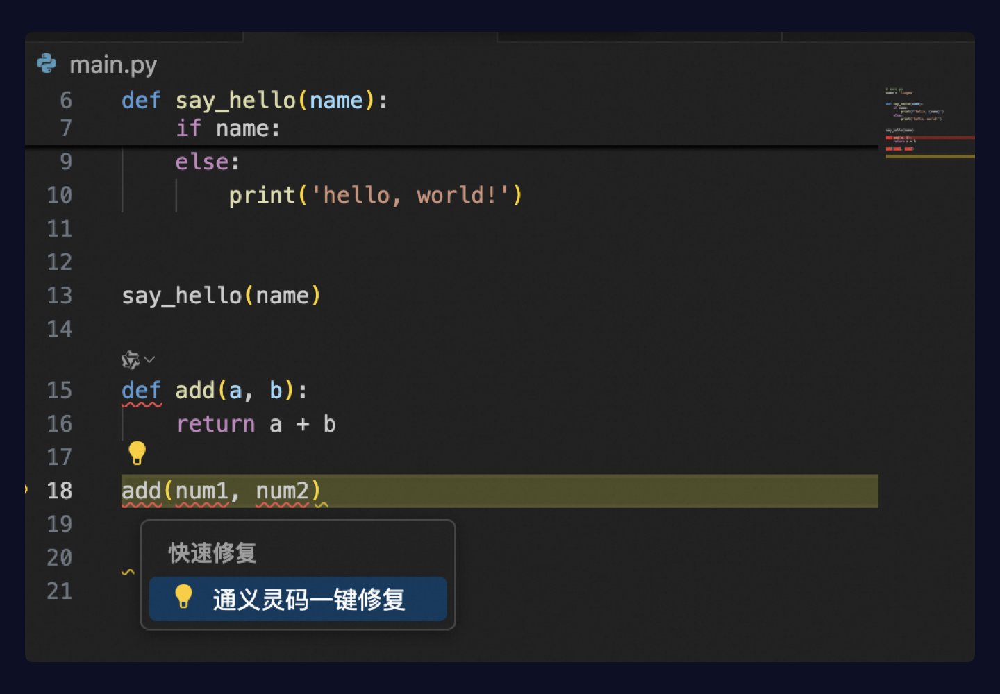 在 main.py 文件末尾输入函数头:def add(a, b):