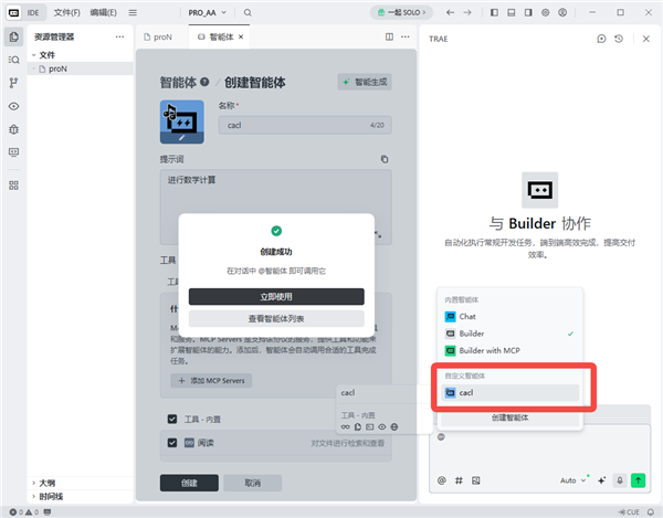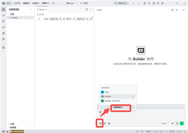 1、打开并登录TRAE AI编程工具,在AI对话框中点击@图标,然后点击【创建智能体】。
