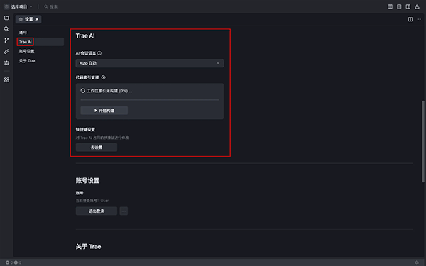 2、从左侧导航栏中,选择 Trae AI。你已进入 AI 设置部分。