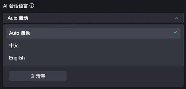 在 AI 会话语言 处,选择 AI 回答时所用的语言。可选项如下: