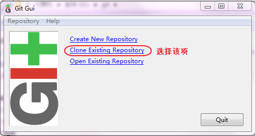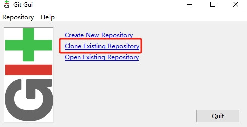 弹出 Git GUI 操作界面后,选择界面中的第二个选项(克隆已存在的仓库),进入克隆配置页面。