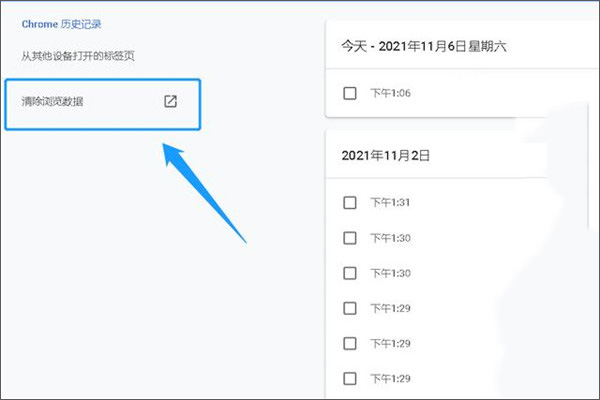 4、点击进入“历史记录”选项后,在弹出的界面里选择“清除浏览数据”。