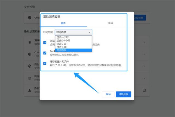 5、点击进入“清除浏览数据”选项,在弹出的界面上方,设置删除浏览数据的“时间范围”,最后点击清除数据即可。