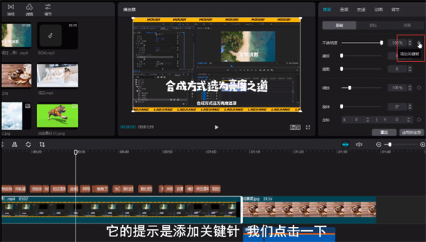 1、选中视频中的某个位置,点击不透明度的菱形,它的提示是添加关键帧,单击一下,在素材上看到一个菱形标志,这个点就是关键帧。